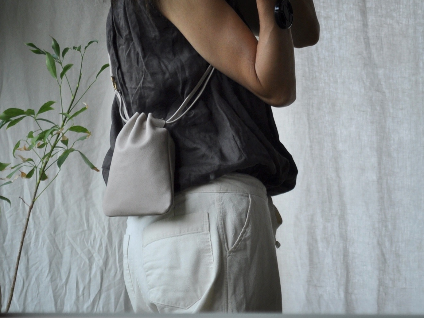 ちょっとしたお出かけにぴったりの巾着。巾着のくしゅっとした可愛さと、革の質感のバランスがいい、