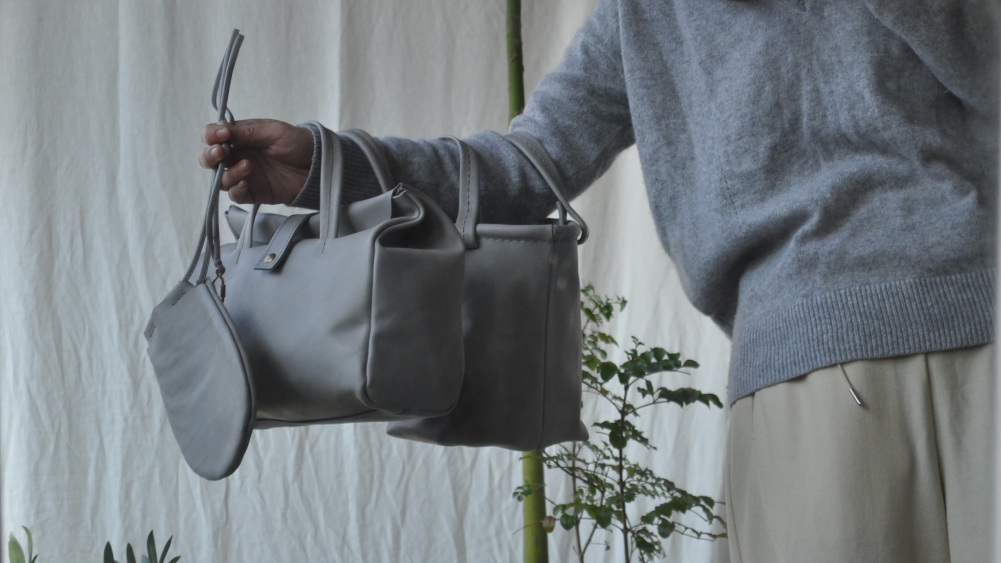 定番カラーのライトグレーcenereのバケツバッグとロールバッグです。